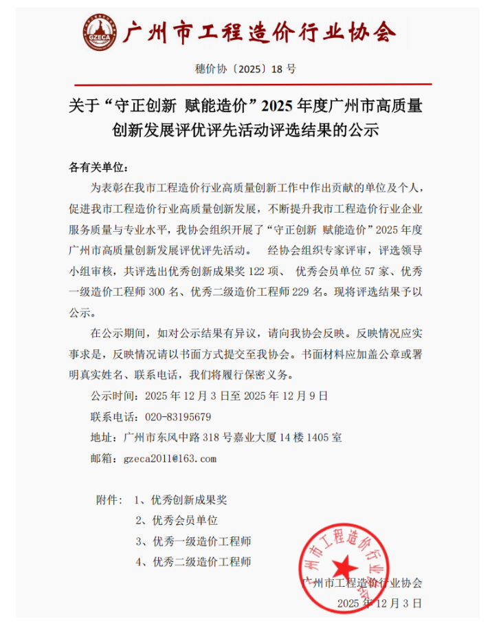关于“守正创新 赋能造价”2025年度广州市高质量创新发展评优评先活动评选结果的公示(穗价协〔2025〕18号)