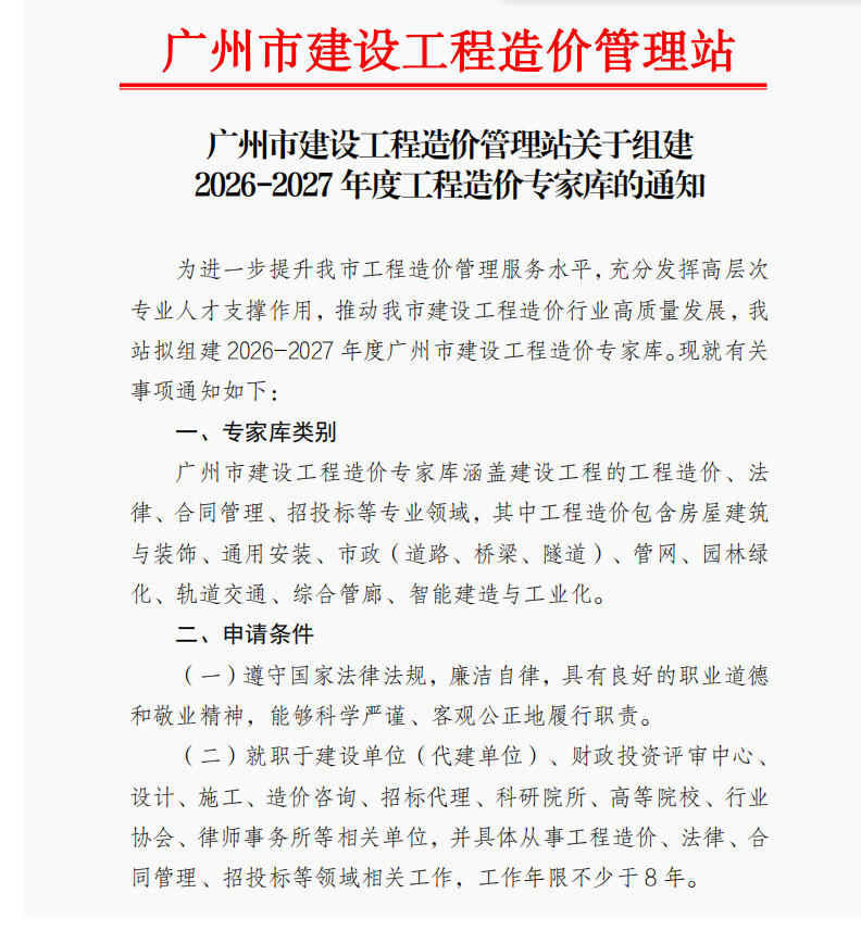 广州市建设工程造价管理站关于组建2026-2027 年度工程造价专家库的通知